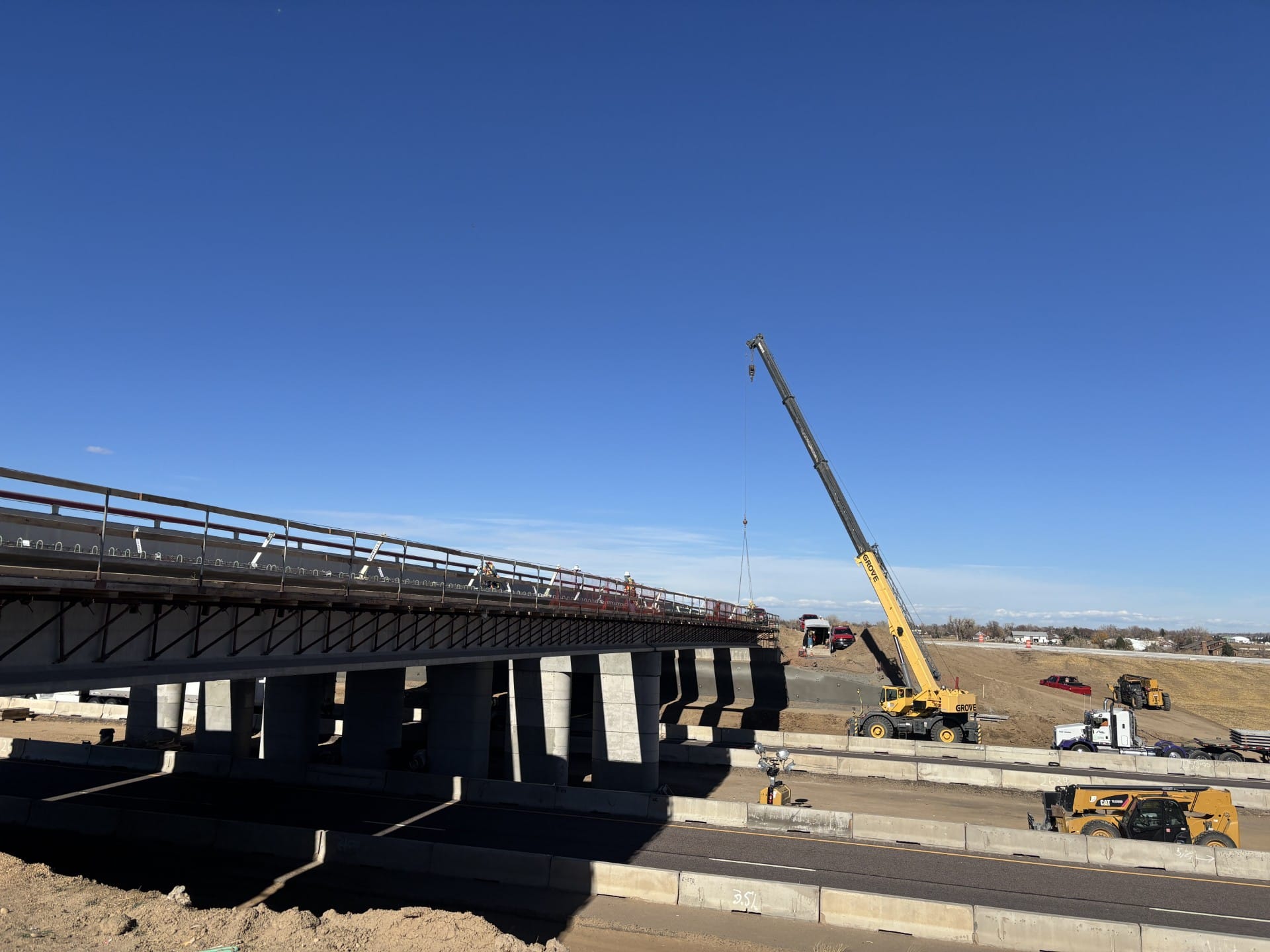 Led by Project Manager John Koussis, Project Engineer Zach Heyne, and Foremen Chance Gurule, Jaime Aguirre, and Luis Gallegos, crews used two 500-ton hydraulic cranes to rig, set, and brace one girder every 30 minutes. The operation proceeded in just three hours each night over two consecutive nights, with significant traffic control coordination with E-470, CDOT, Adams County, and the City of Brighton.